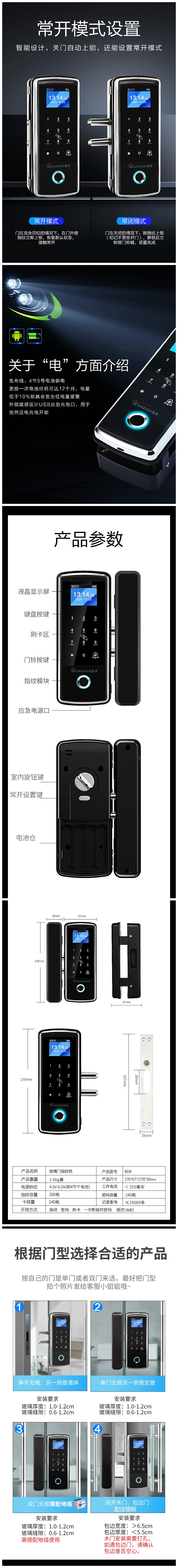 免布线,免开孔玻璃门指纹锁808